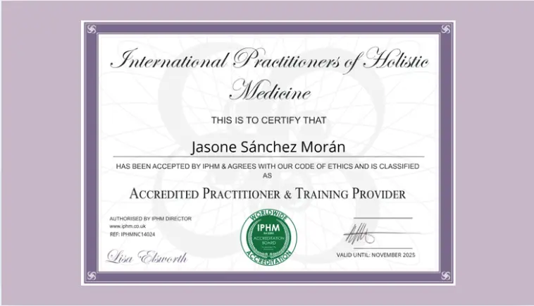 Certificación de Jasone Sánchez como Profesional de la Medicina Holística, por la IPHM para sus cursos de Reiki y curso de Gemoterapia