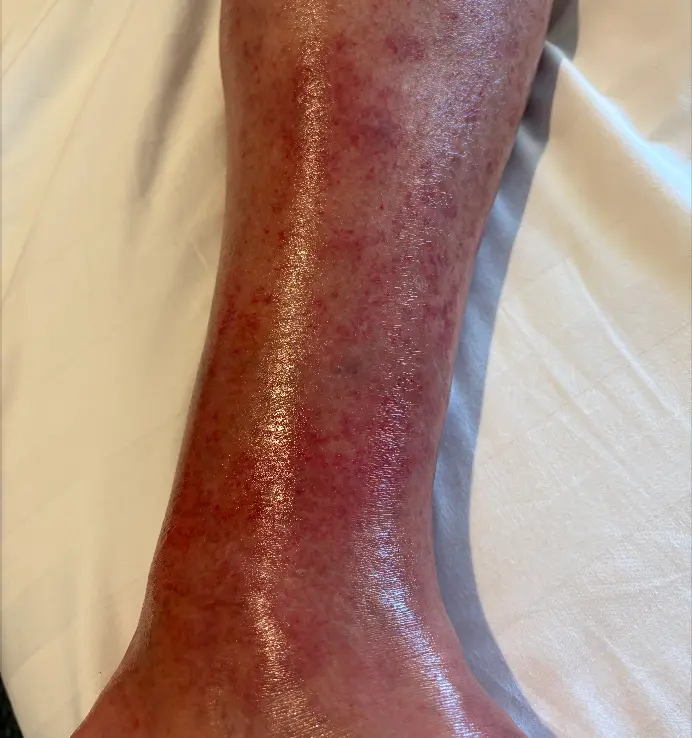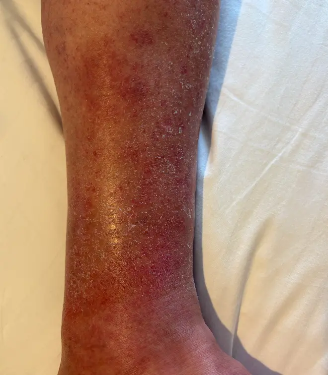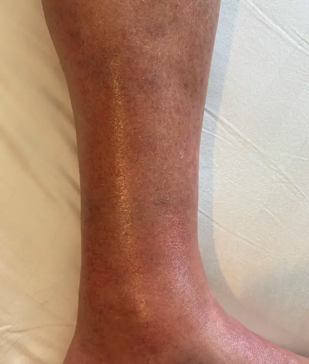 Dado su historial, la compresión continua de la rodillera, el calor y la sobrecarga física provocaron un estancamiento del retorno venoso, dando lugar a un cuadro de dermatitis por estasis en desarrollo.