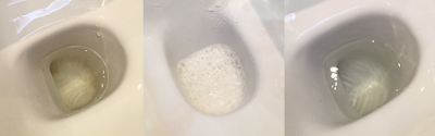 Nada más contactar las dos sustancias producen una espuma de efervescencia, señal que están actuando, la dejamos unos minutos y pasamos la escobilla por toda la superficie. El resultado es el siguiente: Wáter limpio y desinfectado sin lejías ni productos químicos.