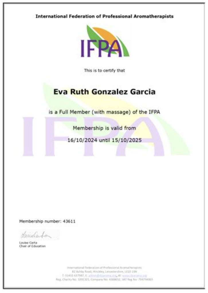 Además de autora y conferenciante, está certificada por las principales organizaciones internacionales de aromaterapia (NAHA, IFA, IFPA, Cofenat) y desde 2025 forma parte de la ICAN. Actualmente, combina su labor docente con la práctica terapéutica, formando a futuras profesionales en aromaterapia familiar, clínica y emocional desde una mirada vivencial y consciente.